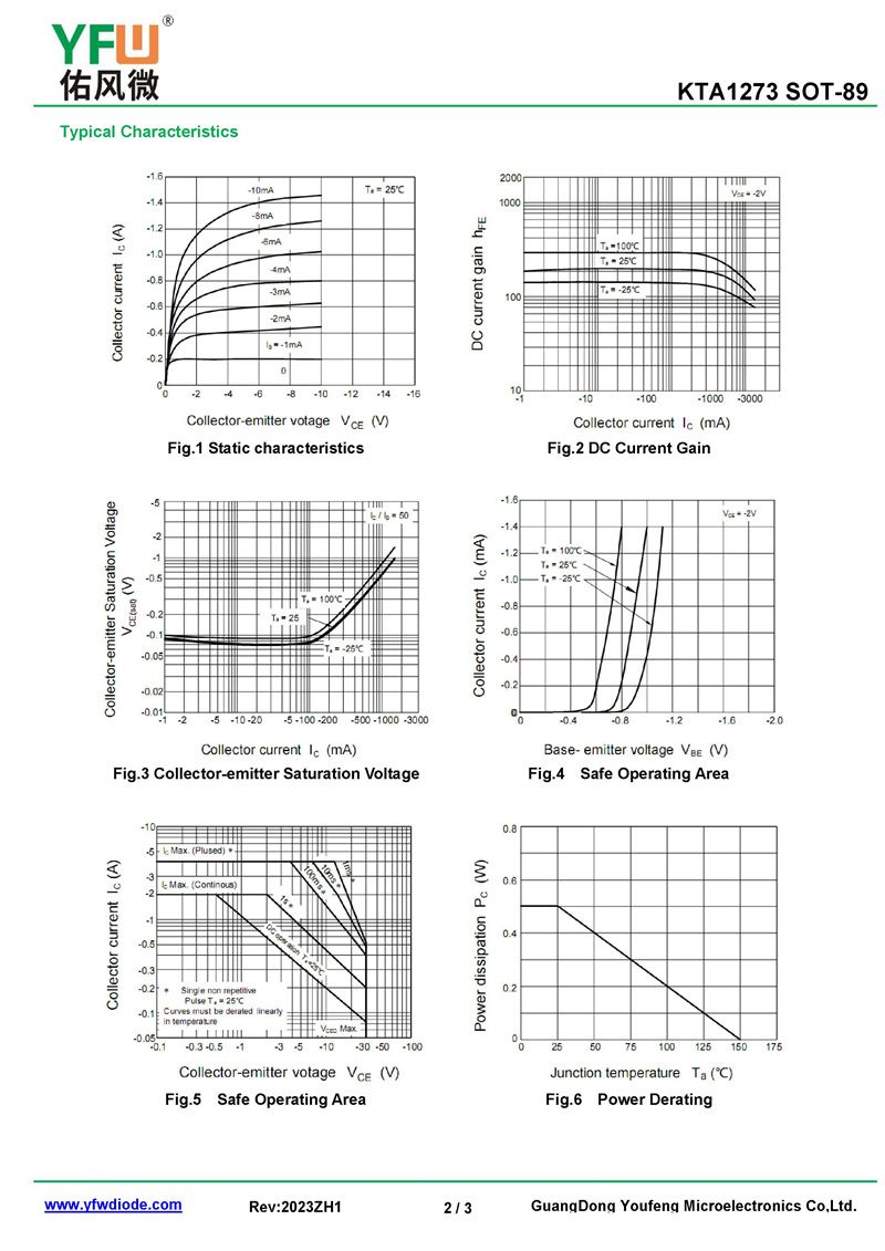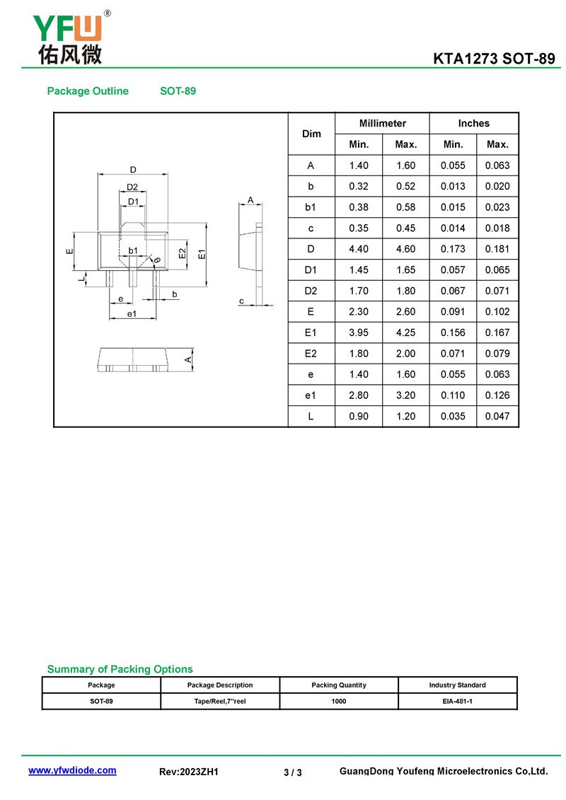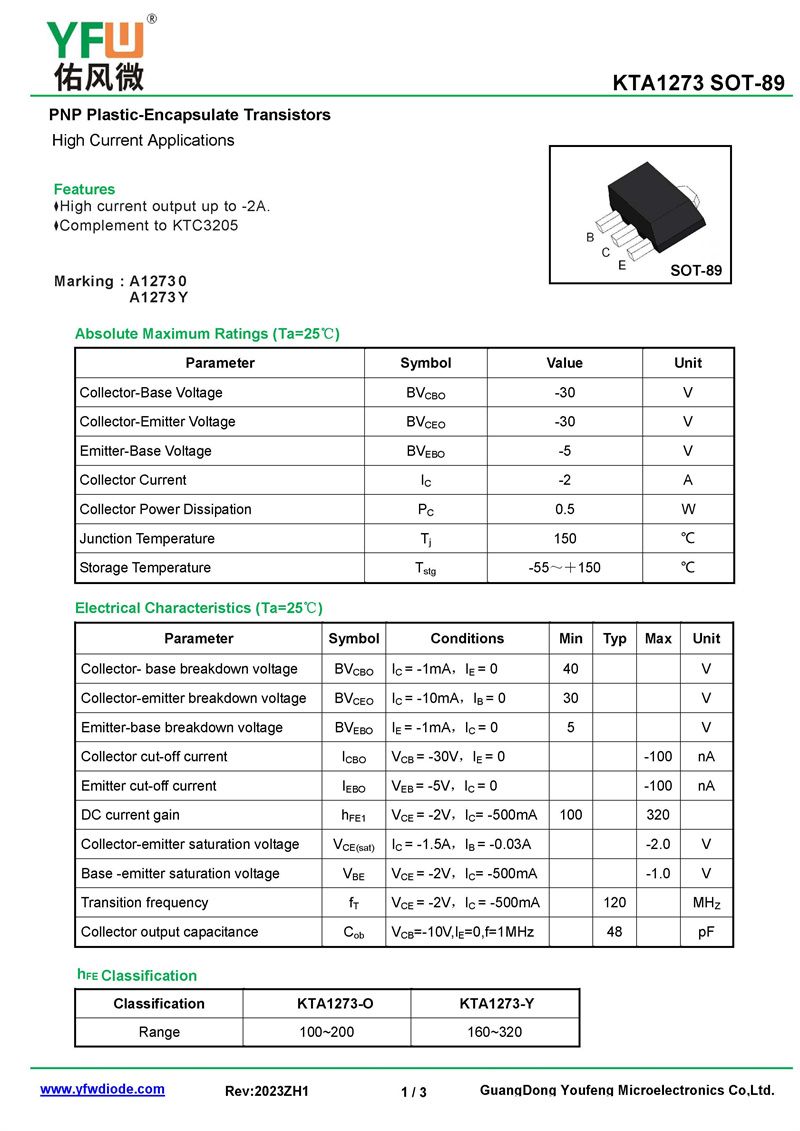 三極管KTA1273-O 規格書_價格_PDF手冊-廣東佑風微原廠KTA1273-O SOT-89_(YFW佑風微)品牌