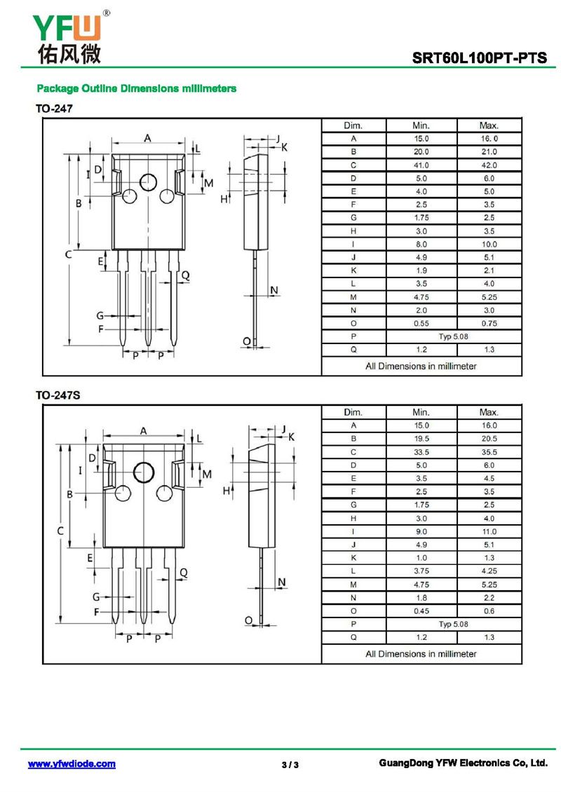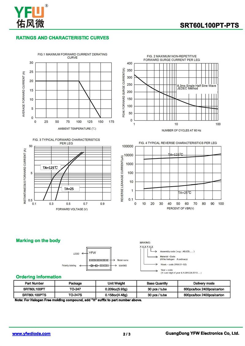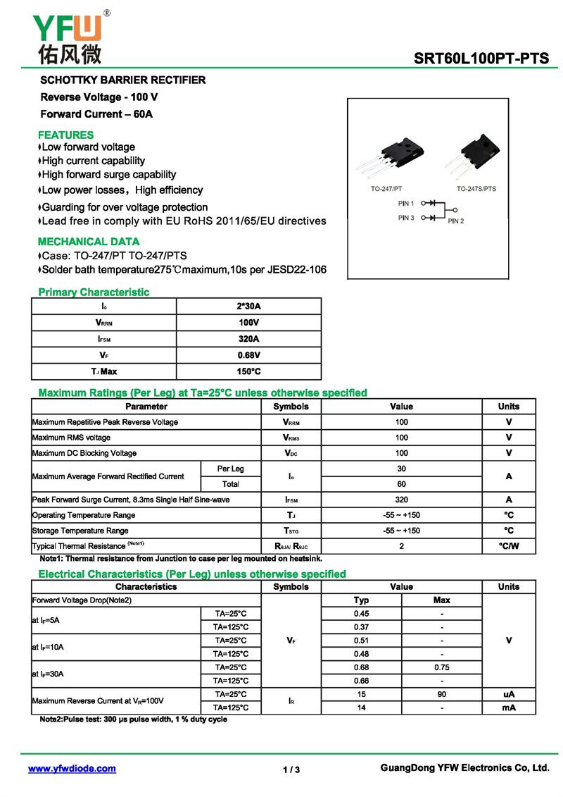 低正向肖特基二極管SRT60L100PT規(guī)格書_價(jià)格_PDF手冊(cè)-廣東佑風(fēng)微原廠SRT60L100PT TO-247_(YFW佑風(fēng)微)品牌