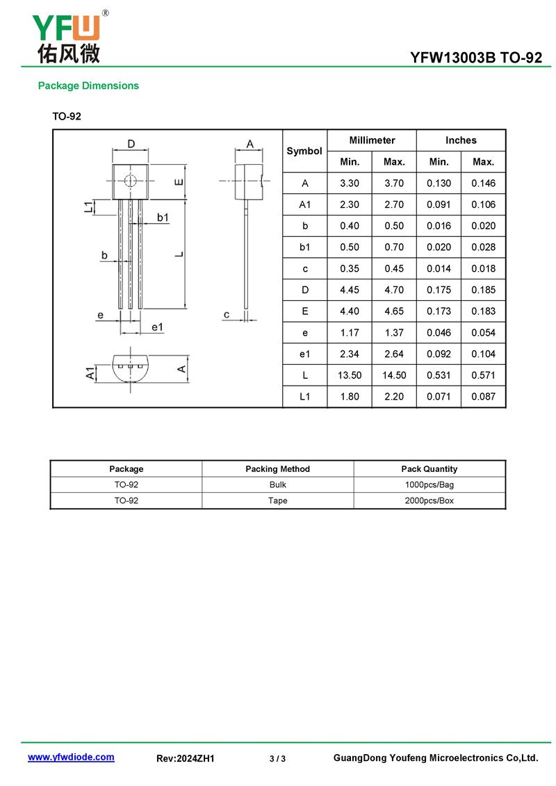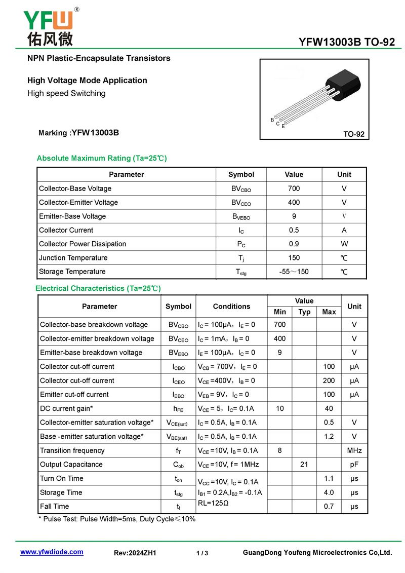 晶體管YFW13003B 規格書_價格_PDF手冊-廣東佑風微原廠YFW13003B TO-92_(YFW佑風微)品牌