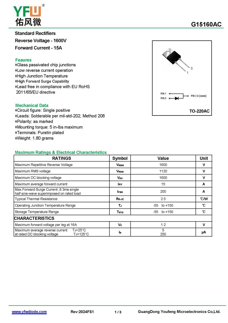 標準整流器G15160AC 規格書_價格_PDF手冊-廣東佑風微原廠G15160AC TO-220AC_(YFW佑風微)品牌