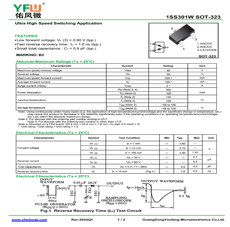 二極管 1SS301W 規格書_價格_PDF手冊-廣東佑風微原廠1SS301W SOT-323_(YFW佑風微)品牌