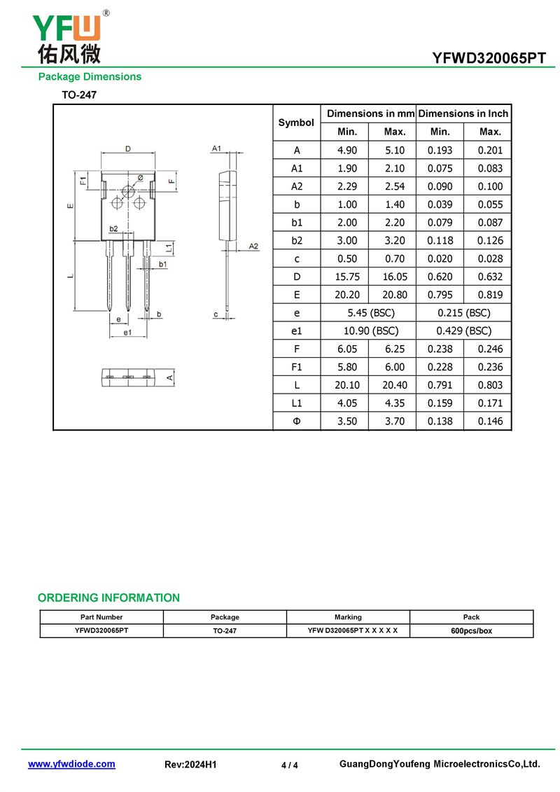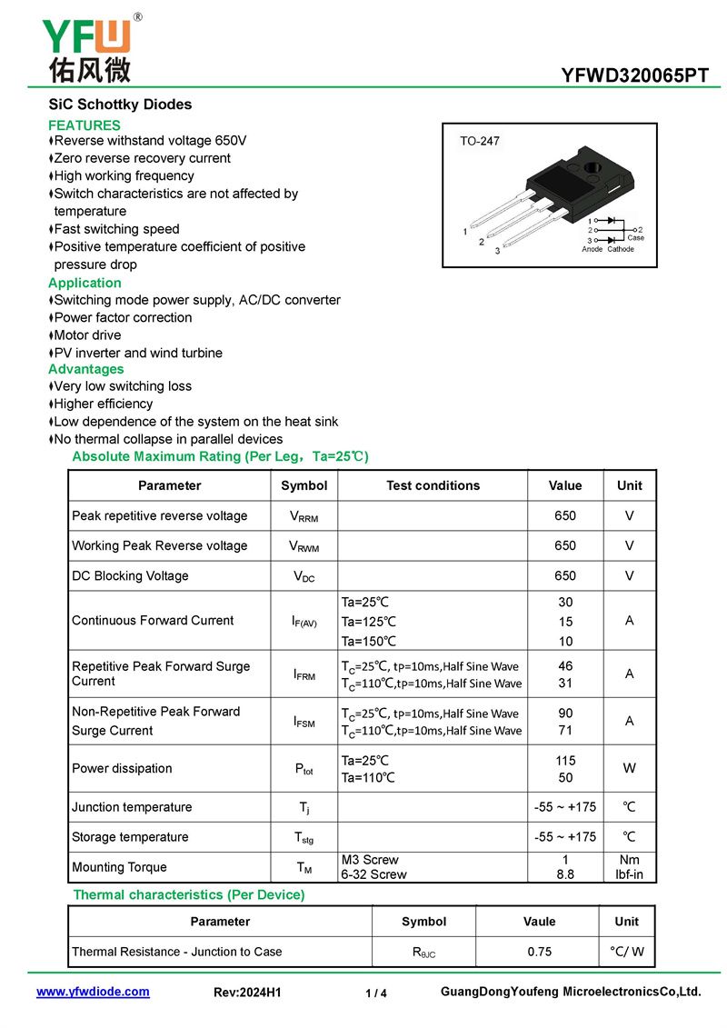 Sic碳化硅肖特基 YFWD320065PT 規格書_價格_PDF手冊-廣東佑風微原廠YFWD320065PT TO-247_(YFW佑風微)品牌