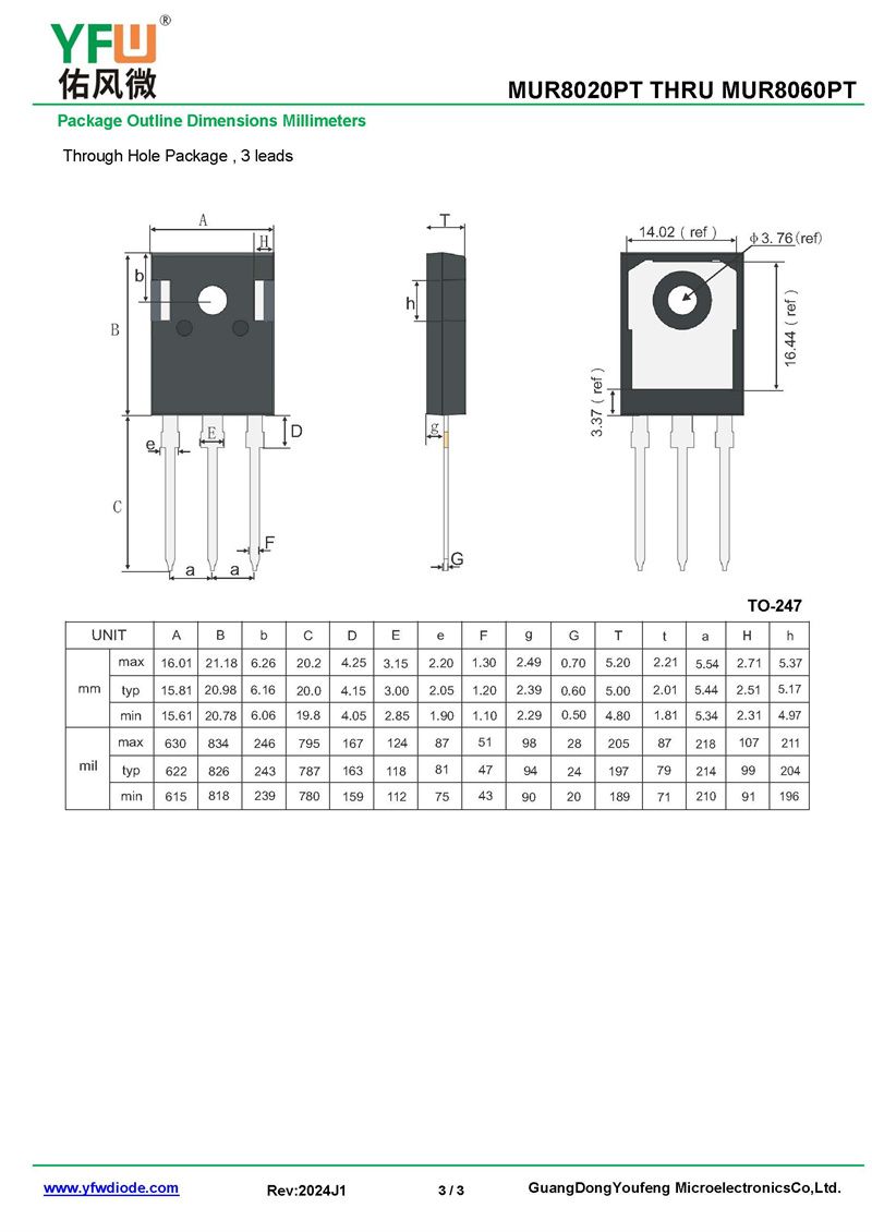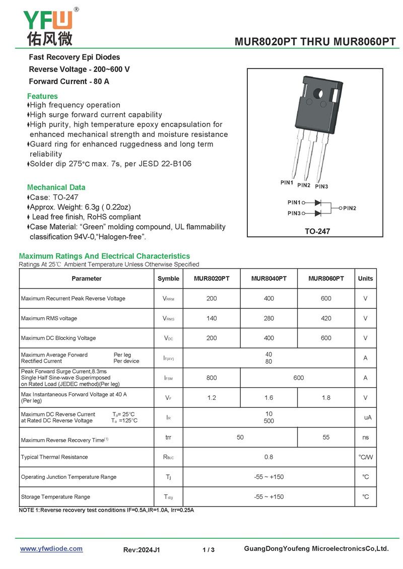 快恢復二極管 MUR8020PT 規格書_價格_PDF手冊-廣東佑風微原廠MUR8020PT TO-247_(YFW佑風微)品牌
