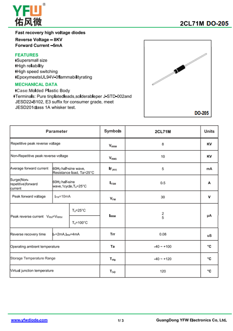高壓二極管2CL71M 規格書_價格_PDF手冊-廣東佑風微原廠2CL71M DO-41_(YFW佑風微)品牌