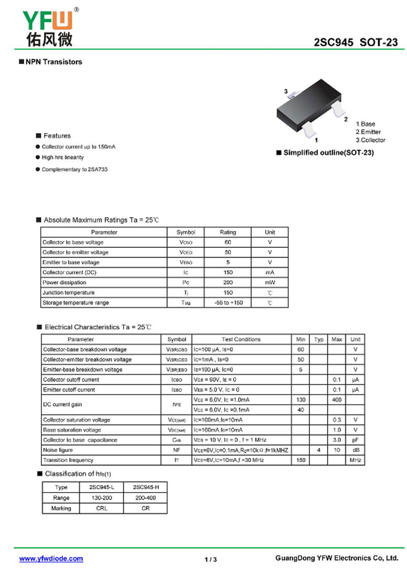 晶體管2SC945 規(guī)格書_價格_PDF手冊-廣東佑風(fēng)微原廠2SC945 SOT-23_(YFW佑風(fēng)微)品牌