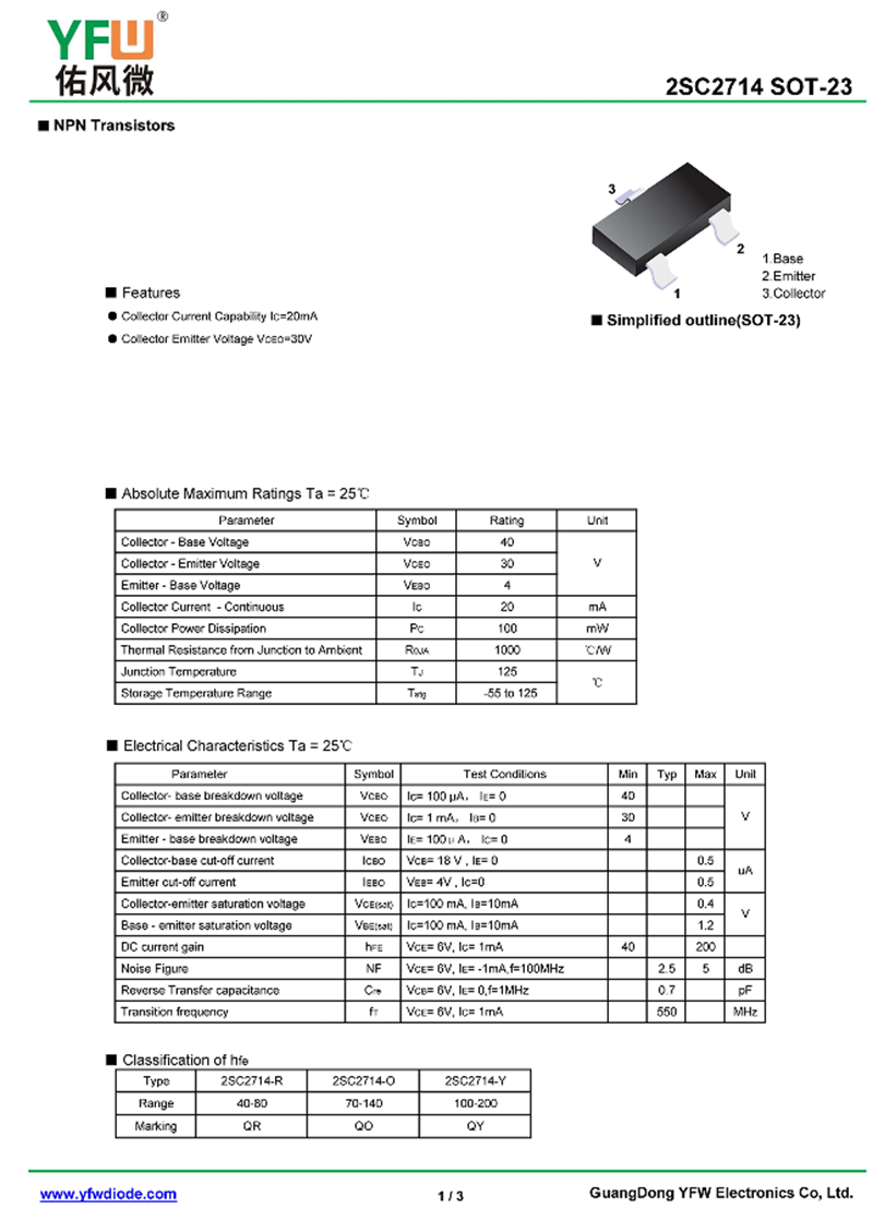 晶體管2SC2714 規格書_價格_PDF手冊-廣東佑風微原廠2SC2714 SOT-23_(YFW佑風微)品牌