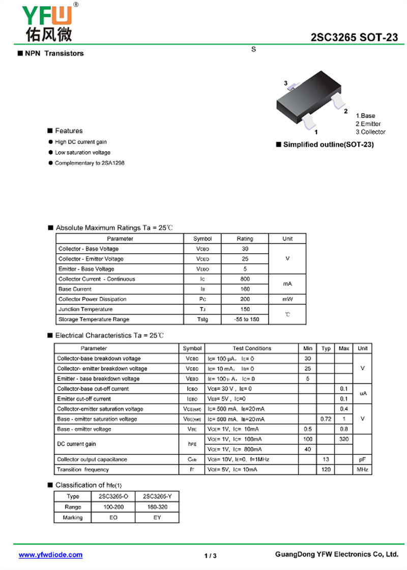 晶體管2SC3265 規(guī)格書(shū)_價(jià)格_PDF手冊(cè)-廣東佑風(fēng)微原廠2SC3265 SOT-23_(YFW佑風(fēng)微)品牌