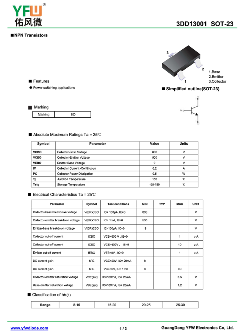 晶體管3DD13001 規(guī)格書_價格_PDF手冊-廣東佑風微原廠3DD13001 SOT-23_(YFW佑風微)品牌