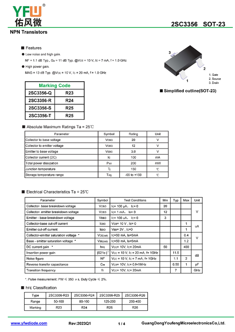 晶體管2SC3356 規格書_價格_PDF手冊-廣東佑風微原廠2SC3356 SOT23-3L_(YFW佑風微)品牌