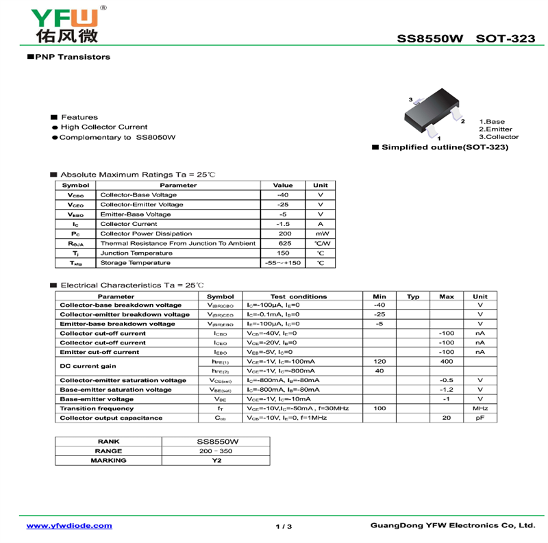 晶體管SS8550W 規格書_價格_PDF手冊-廣東佑風微原廠SS8550W SOT-323_(YFW佑風微)品牌