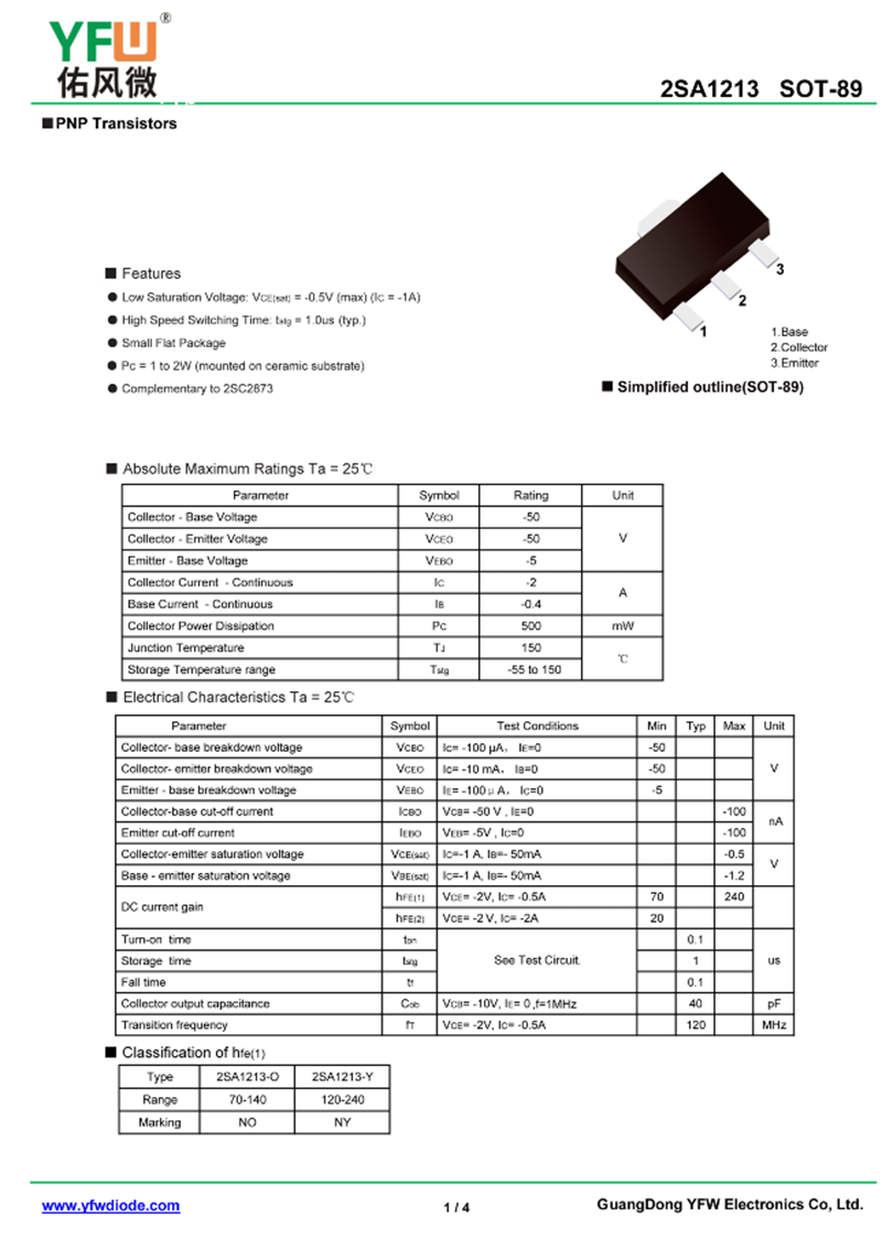 晶體管2SA1213 規(guī)格書_價格_PDF手冊-廣東佑風(fēng)微原廠2SA1213 SOT-89_(YFW佑風(fēng)微)品牌