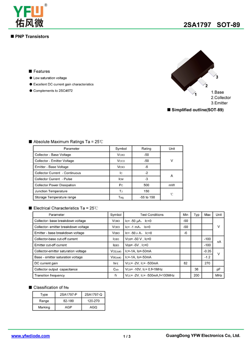 晶體管2SA1797 規格書_價格_PDF手冊-廣東佑風微原廠2SA1797 SOT-89_(YFW佑風微)品牌