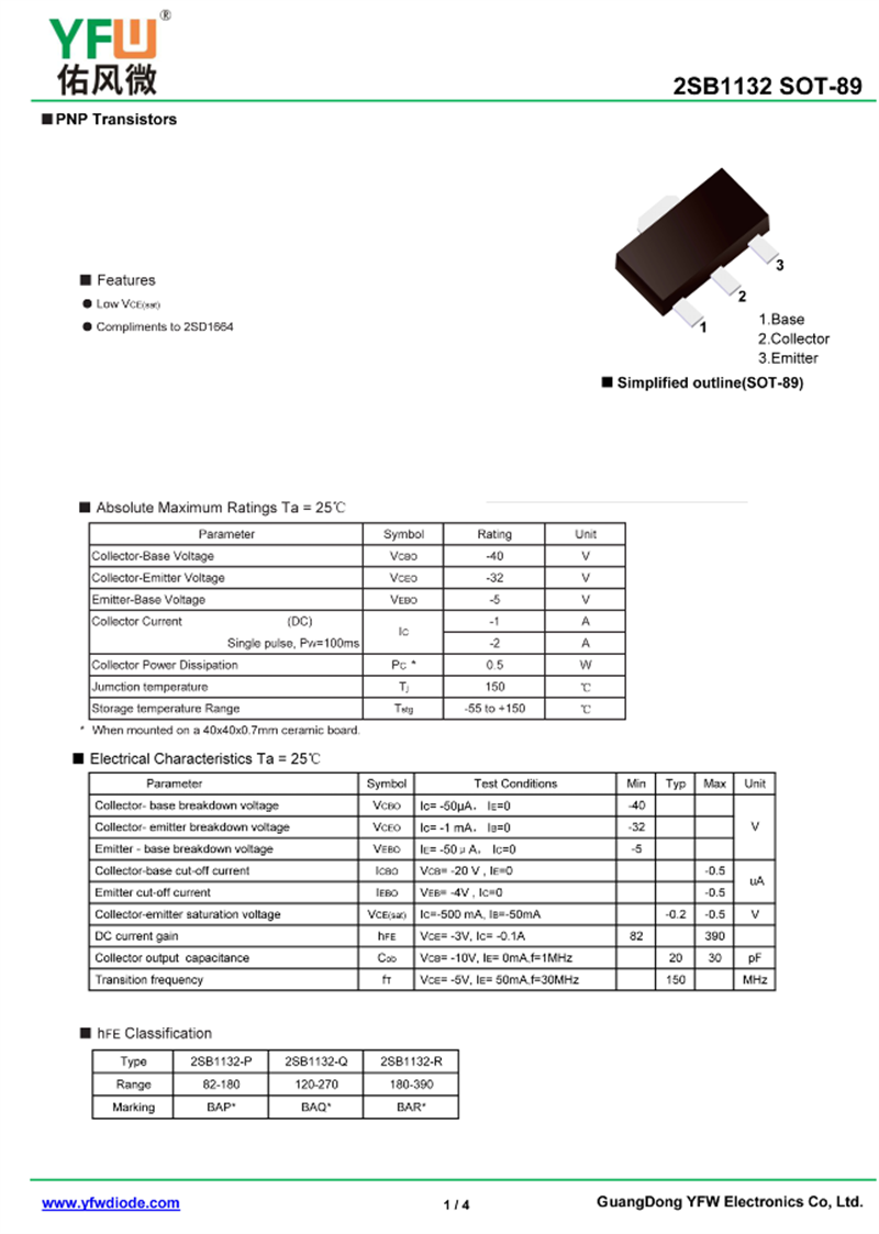 晶體管2SB1132規格書_價格_PDF手冊-廣東佑風微原廠2SB1132 SOT-89_(YFW佑風微)品牌
