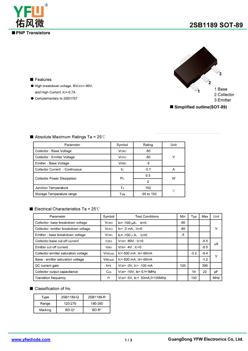 晶體管2SB1189 規格書_價格_PDF手冊-廣東佑風微原廠2SB1189 SOT-89_(YFW佑風微)品牌