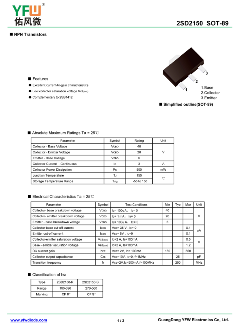 晶體管2SD2150 規格書_價格_PDF手冊-廣東佑風微原廠2SD2150 SOT-89_(YFW佑風微)品牌