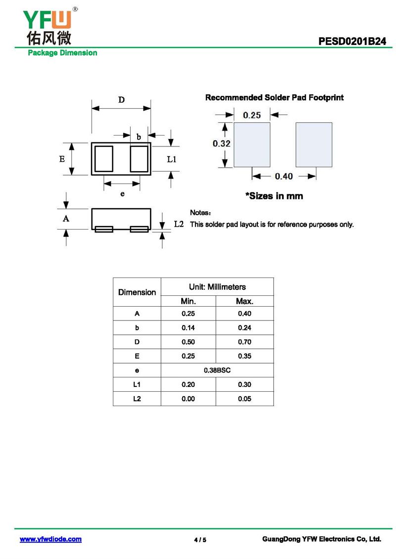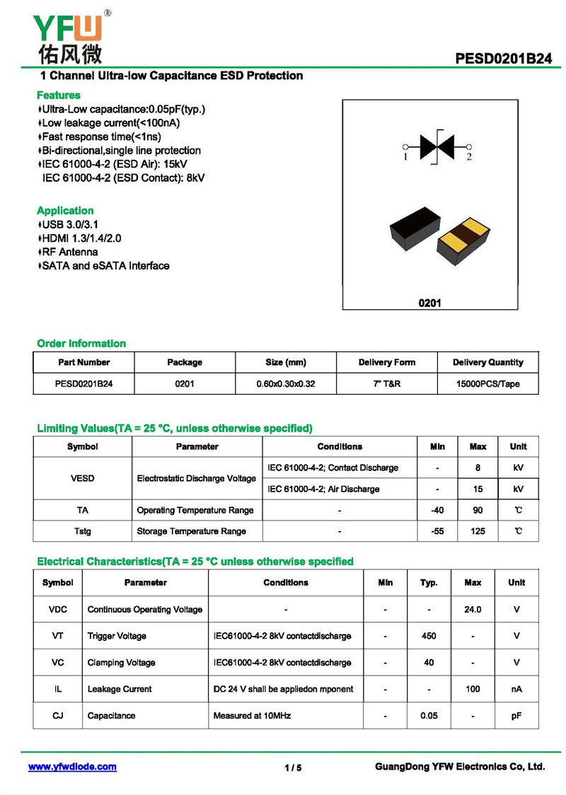 靜電保護二極管PESD0201B24 規格書_價格_PDF手冊-廣東佑風微原廠PESD0201B24 0201_(YFW佑風微)品牌