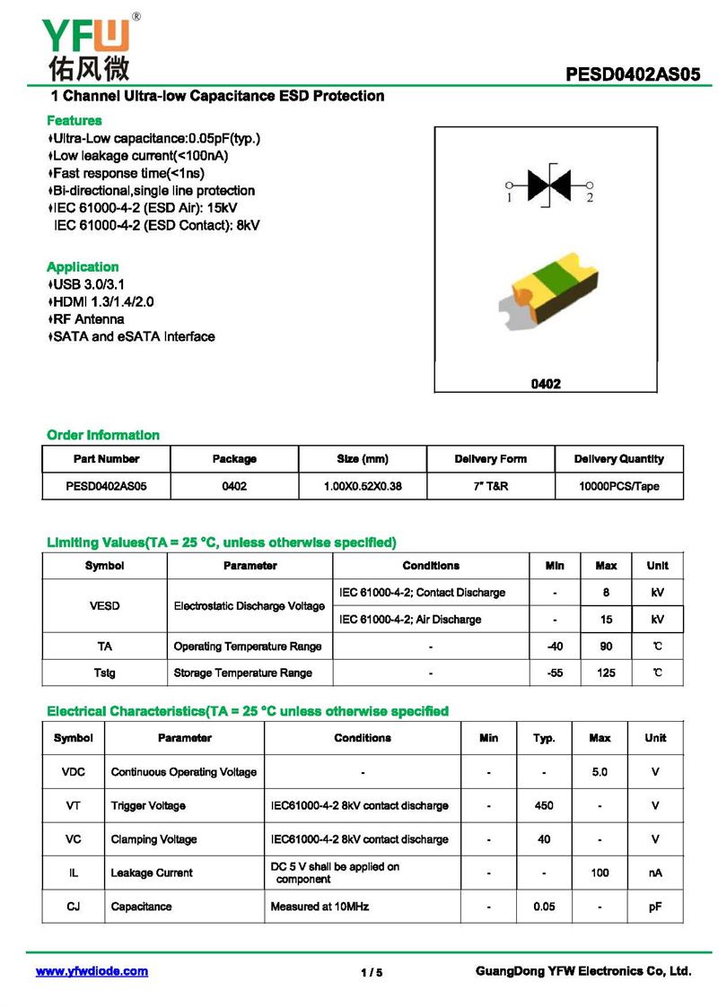 靜電保護二極管PESD0402AS05 規格書_價格_PDF手冊-廣東佑風微原廠PESD0402AS05 0402_(YFW佑風微)品牌