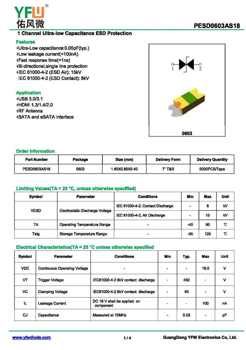 靜電保護(hù)二極管PESD0603AS18 規(guī)格書_價(jià)格_PDF手冊(cè)-廣東佑風(fēng)微原廠PESD0603AS18 0603_(YFW佑風(fēng)微)品牌