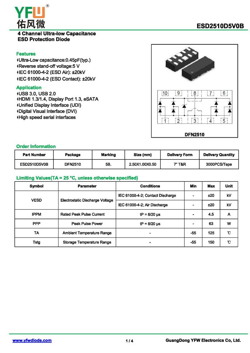 靜電保護(hù)二極管ESD2510D5V0B 規(guī)格書_價(jià)格_PDF手冊-廣東佑風(fēng)微原廠ESD2510D5V0B DFN2510_(YFW佑風(fēng)微)品牌