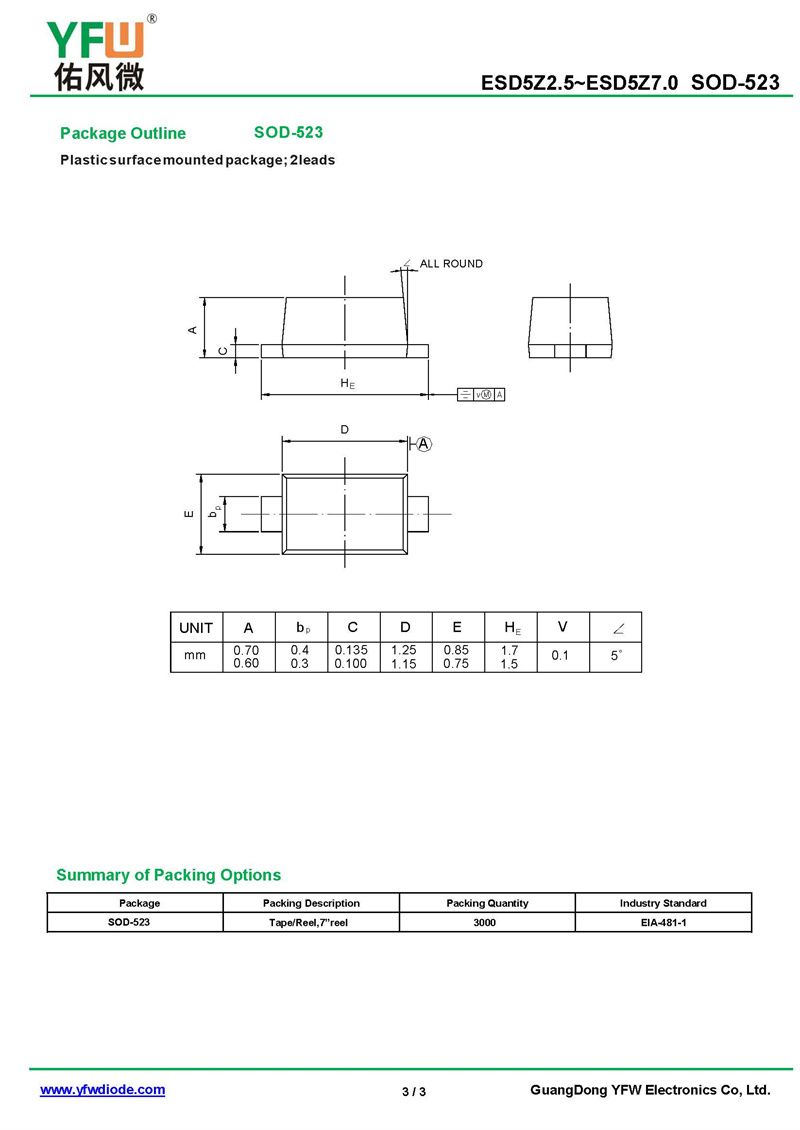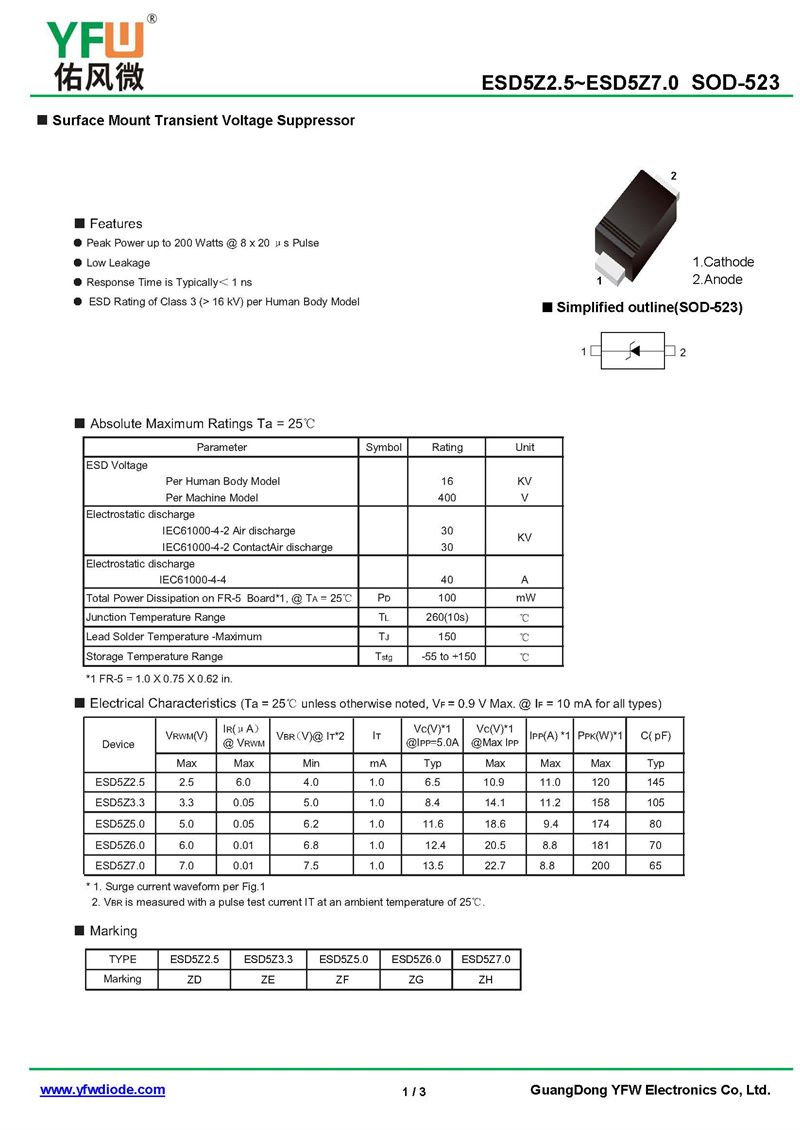 靜電保護(hù)二極管ESD5Z7.0 規(guī)格書(shū)_價(jià)格_PDF手冊(cè)-廣東佑風(fēng)微原廠ESD5Z7.0 SOD-523_(YFW佑風(fēng)微)品牌