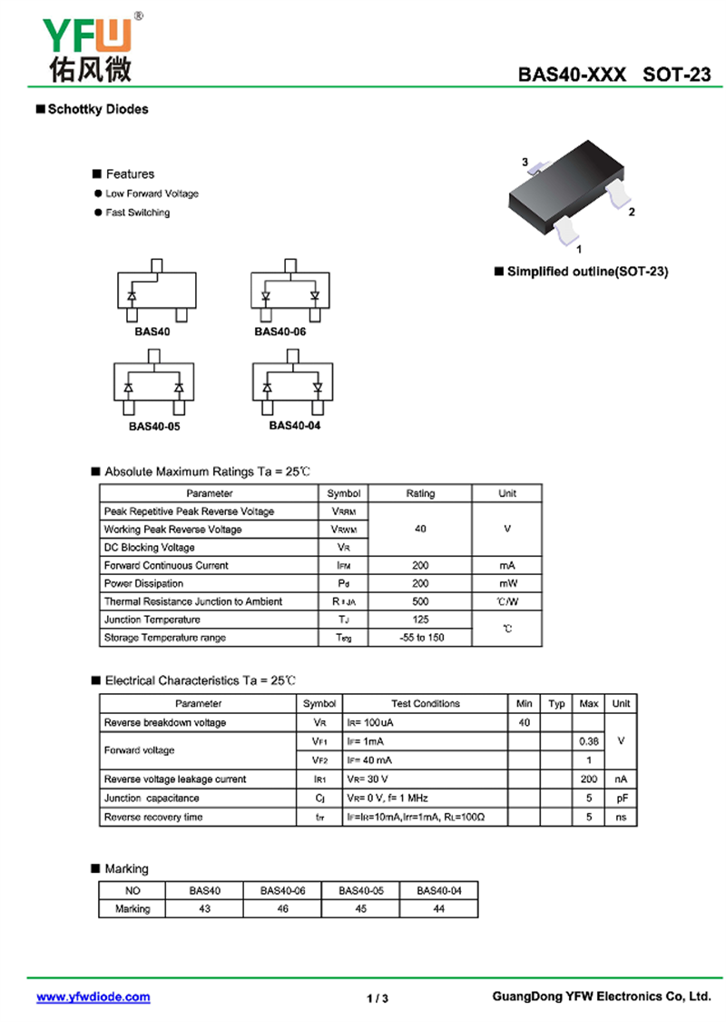 開關二極管BAS40 規格書_價格_PDF手冊-廣東佑風微原廠BAS40 SOT-23_(YFW佑風微)品牌