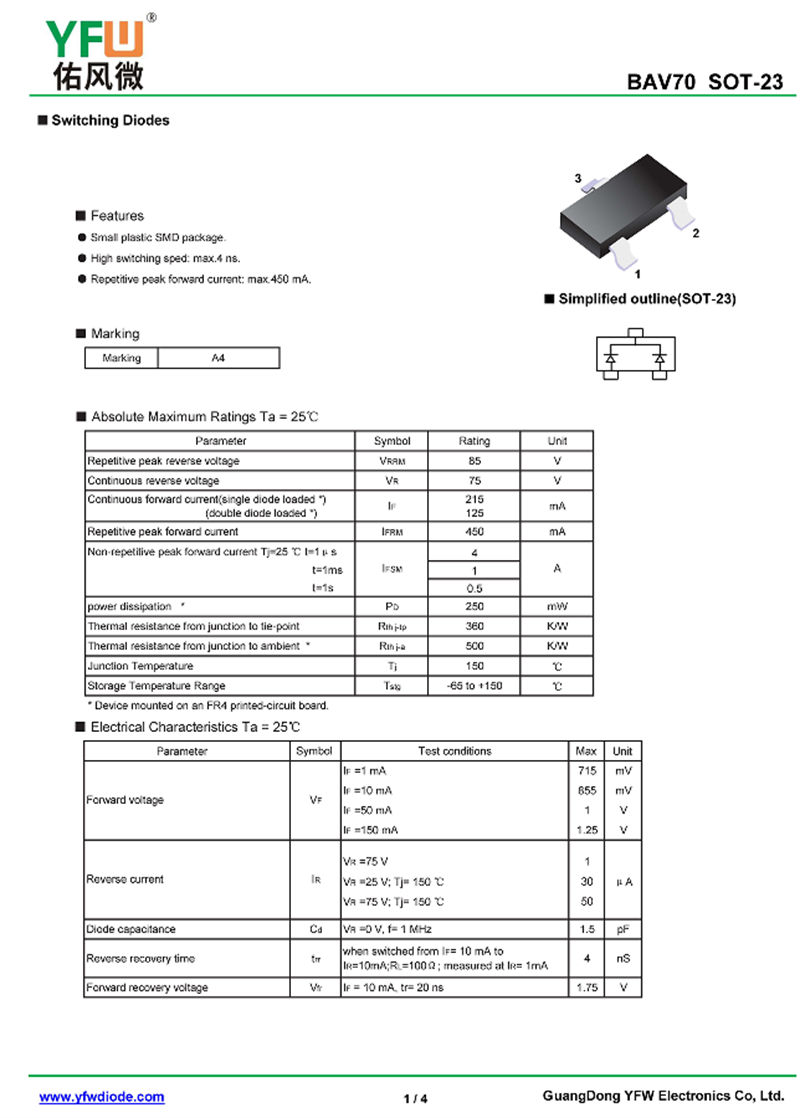 開關二極管BAV70 規格書_價格_PDF手冊-廣東佑風微原廠BAV70 SOT-23_(YFW佑風微)品牌
