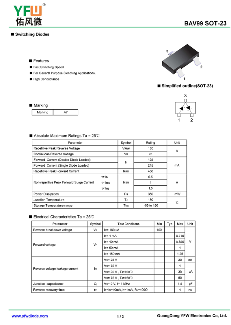 開關二極管BAV99 規(guī)格書_價格_PDF手冊-廣東佑風微原廠BAV99 SOT-23_(YFW佑風微)品牌