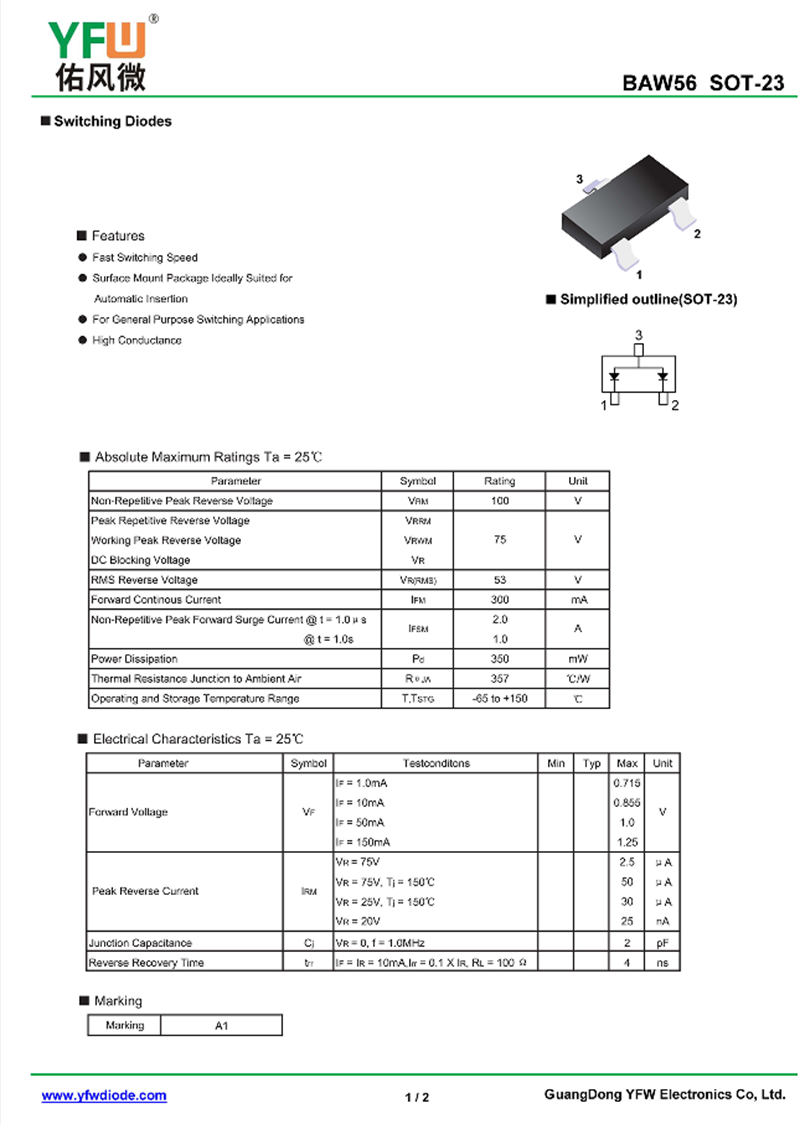 開關(guān)二極管BAW56 規(guī)格書_價格_PDF手冊-廣東佑風(fēng)微原廠BAW56 SOT-23_(YFW佑風(fēng)微)品牌