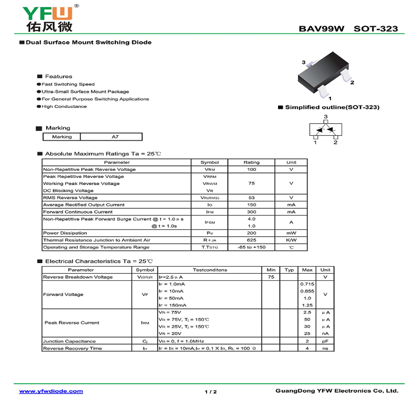 開關二極管BAV99W 規格書_價格_PDF手冊-廣東佑風微原廠BAV99W SOT-323_(YFW佑風微)品牌