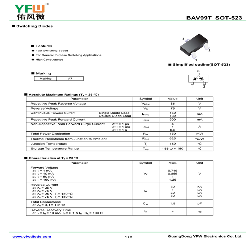 開關(guān)二極管BAV99T 規(guī)格書_價(jià)格_PDF手冊(cè)-廣東佑風(fēng)微原廠BAV99T SOT-523_(YFW佑風(fēng)微)品牌