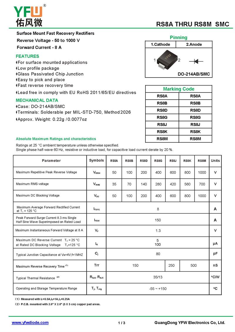 快恢復(fù)二極管RS8G 規(guī)格書_價(jià)格_PDF手冊(cè)-廣東佑風(fēng)微原廠RS8G SMC_(YFW佑風(fēng)微)品牌