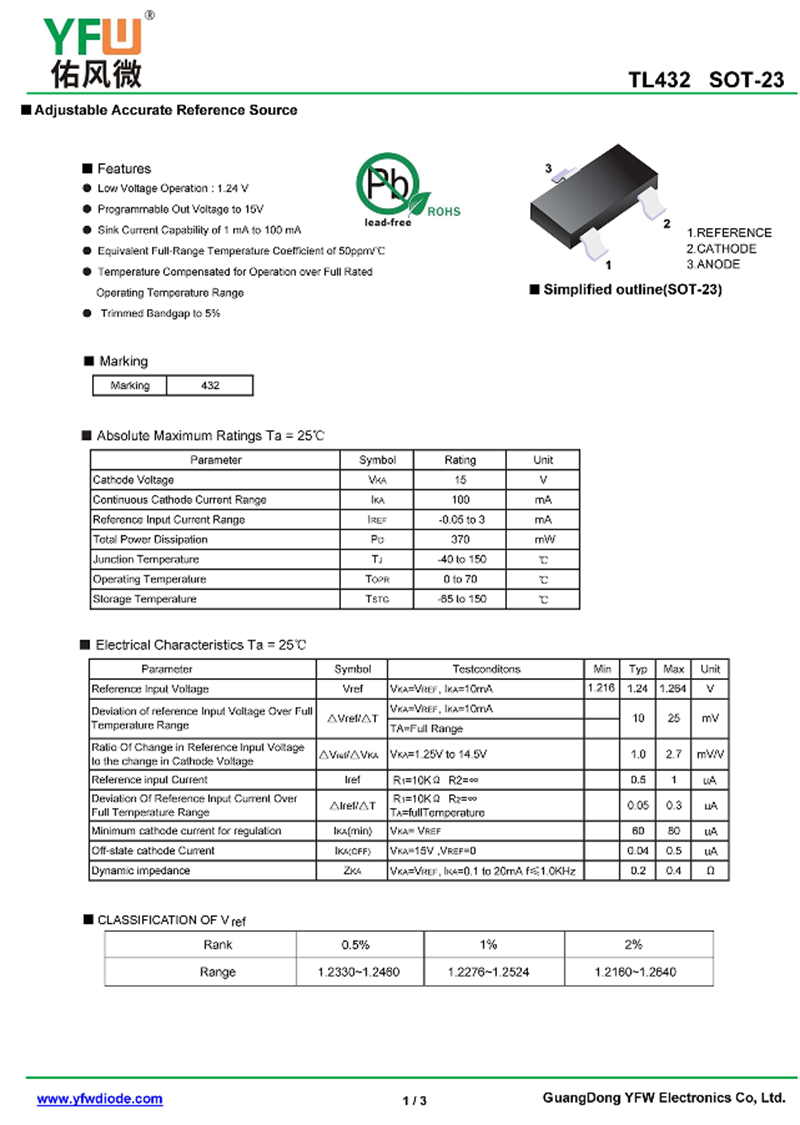 三端穩(wěn)壓管TL432 規(guī)格書_價(jià)格_PDF手冊(cè)-廣東佑風(fēng)微原廠TL432 SOT-23_(YFW佑風(fēng)微)品牌