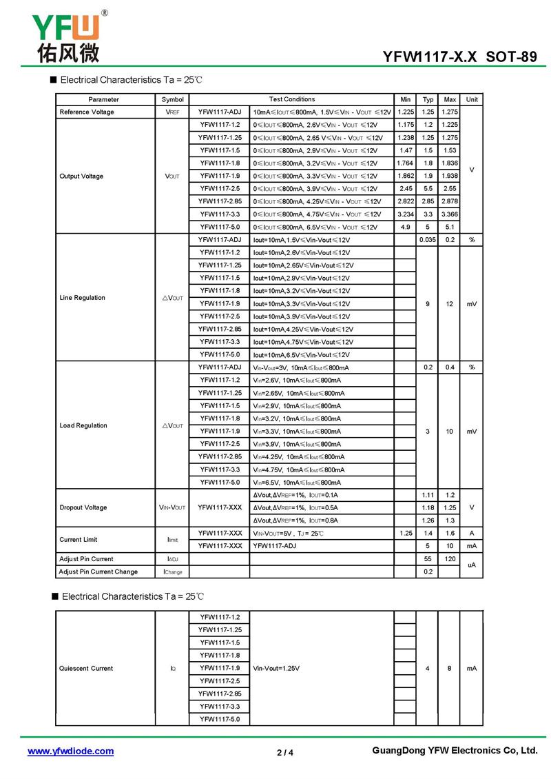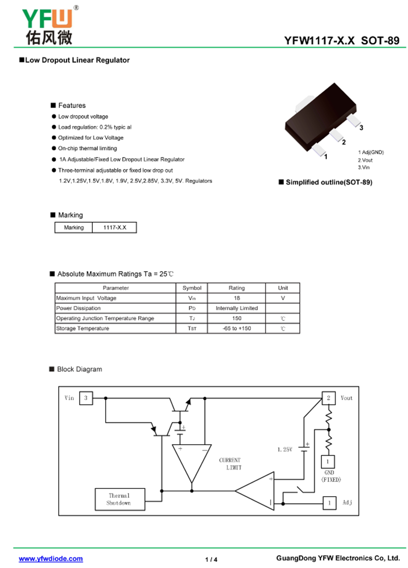 三端穩壓管YFW1117-1.2 規格書_價格_PDF手冊-廣東佑風微原廠YFW1117-1.2 SOT-89_(YFW佑風微)品牌
