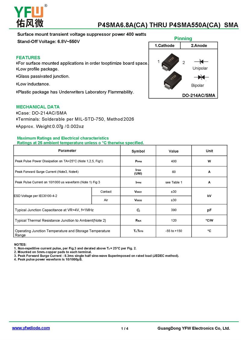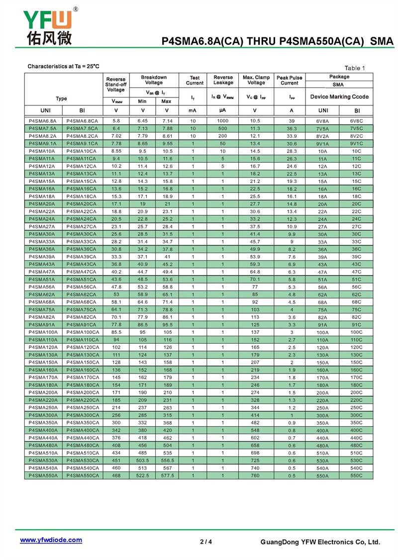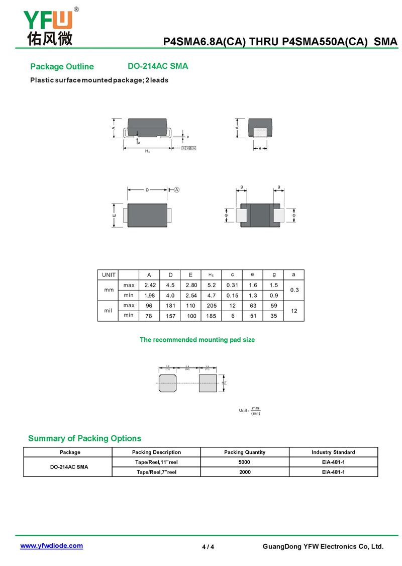 瞬態(tài)抑制二極管P4SMA27A 規(guī)格書_價格_PDF手冊-廣東佑風微原廠P4SMA27A SMA(DO-214AC)_(YFW佑風微)品牌