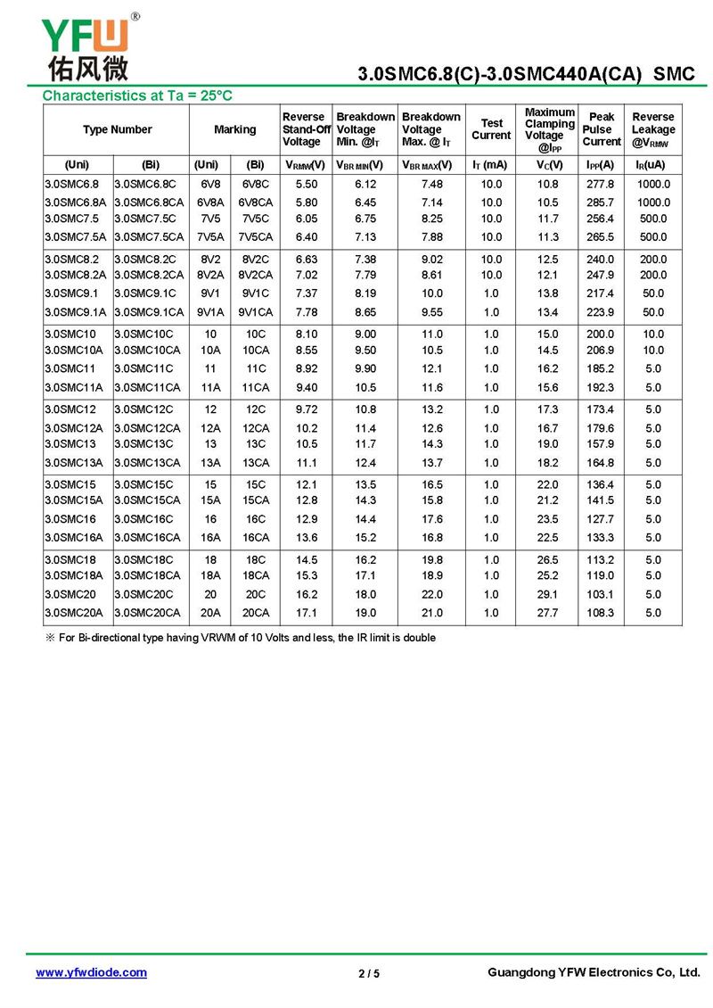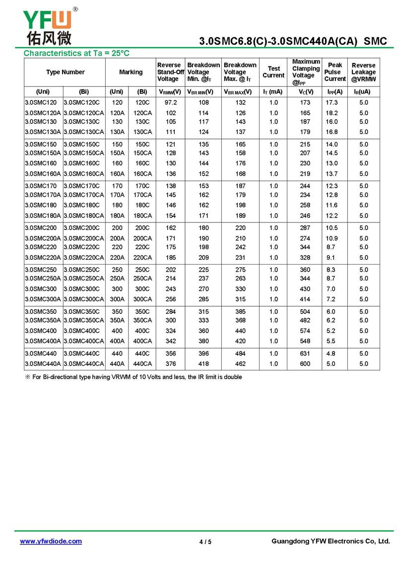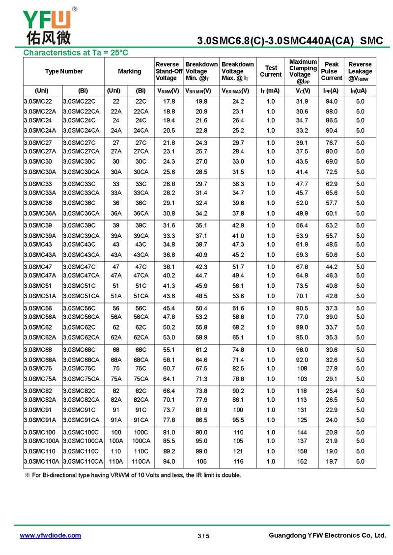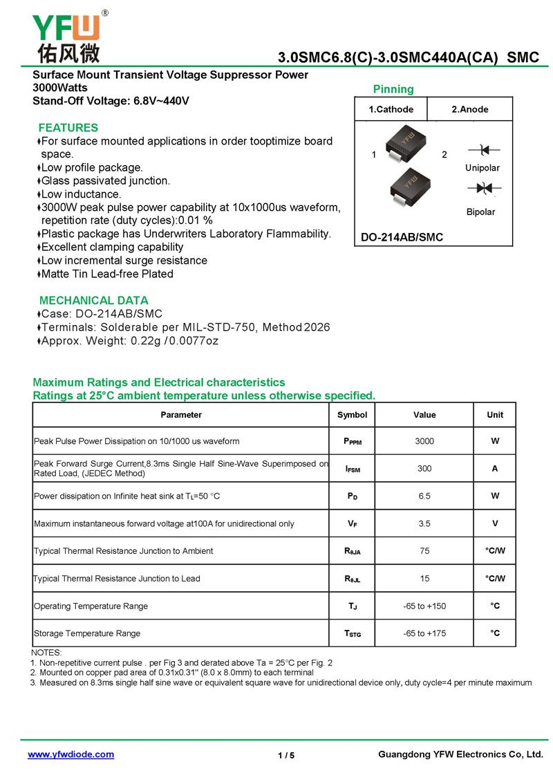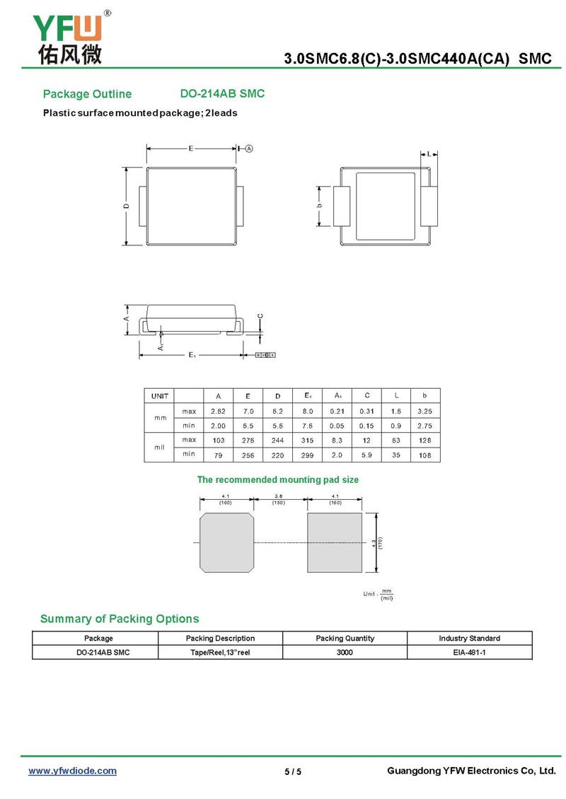 瞬態(tài)抑制二極管3.0SMC440CA 規(guī)格書_價格_PDF手冊-廣東佑風微原廠3.0SMC440CA SMC_(YFW佑風微)品牌