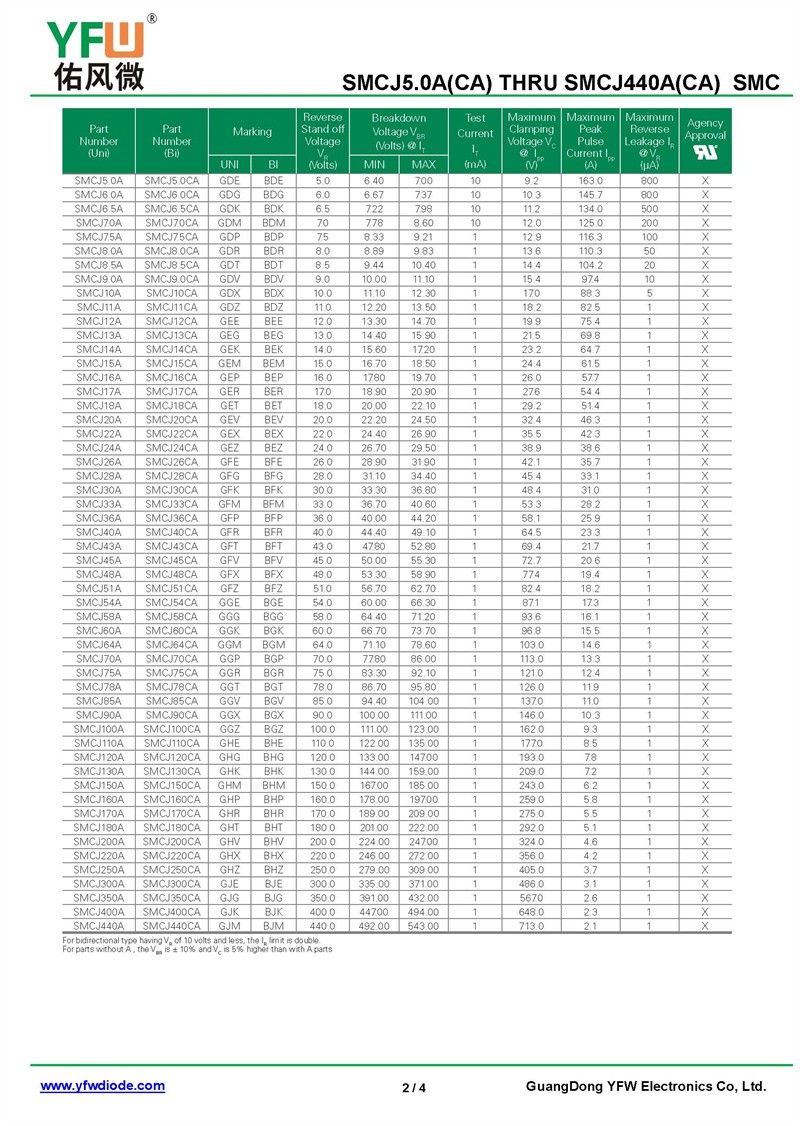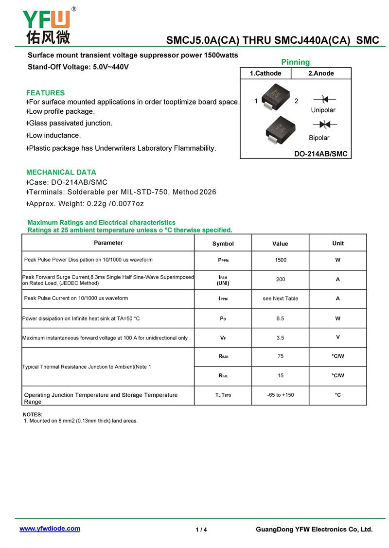 瞬態抑制二極管SMCJ220CA 規格書_價格_PDF手冊-廣東佑風微原廠SMCJ220CA SMC_(YFW佑風微)品牌