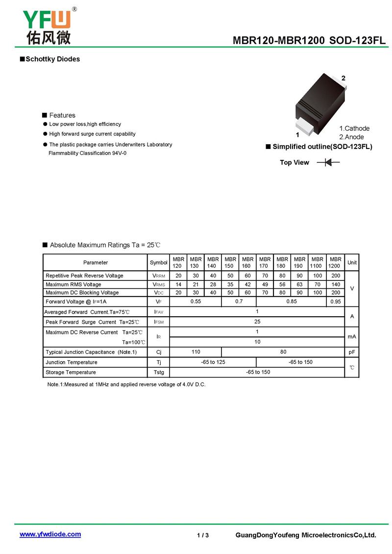 肖特基二極管MBR140 規格書_價格_PDF手冊-廣東佑風微原廠MBR140 SOD-123FL_(YFW佑風微)品牌