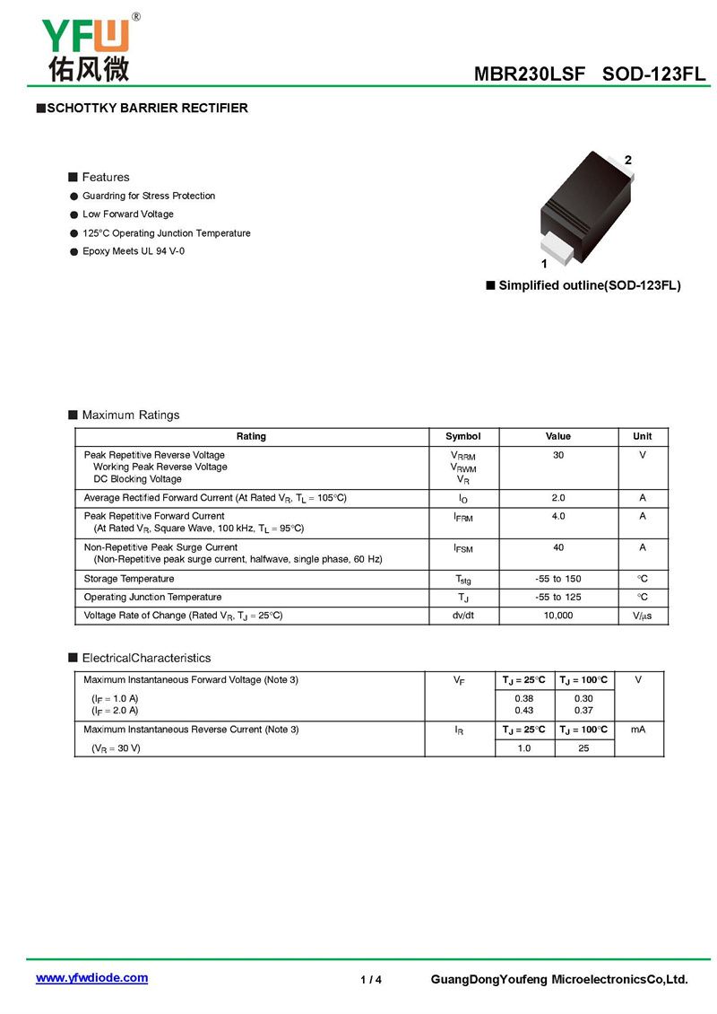 肖特基二極管MBR230LSF 規(guī)格書_價(jià)格_PDF手冊(cè)-廣東佑風(fēng)微原廠MBR230LSF SOD-123FL_(YFW佑風(fēng)微)品牌