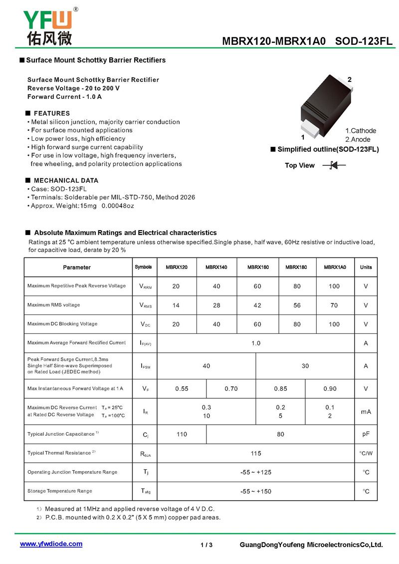 肖特基二極管MBRX140 規格書_價格_PDF手冊-廣東佑風微原廠MBRX140 SOD-123FL_(YFW佑風微)品牌