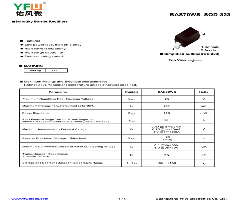 肖特基二極管BAS70WS 規格書_價格_PDF手冊-廣東佑風微原廠BAS70WS SOD-323_(YFW佑風微)品牌