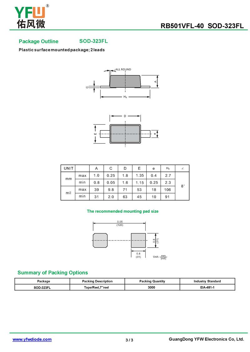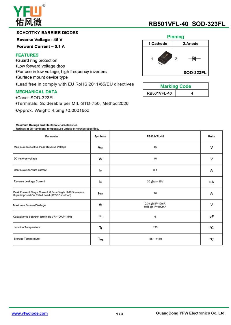 肖特基二極管RB501VFL-40 規格書_價格_PDF手冊-廣東佑風微原廠RB501VFL-40 SOD-323_(YFW佑風微)品牌