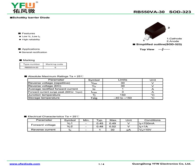 肖特基二極管RB550VA-30 規格書_價格_PDF手冊-廣東佑風微原廠RB550VA-30 SOD-323_(YFW佑風微)品牌