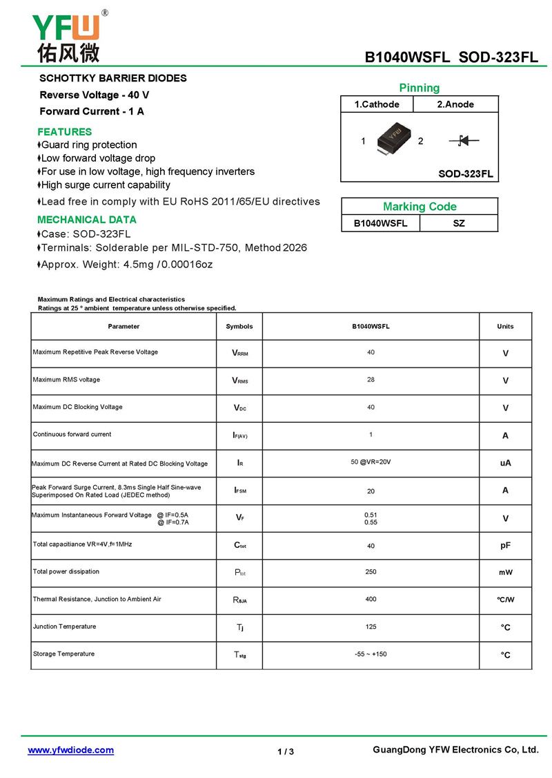 肖特基二極管B1040WSFL 規(guī)格書_價(jià)格_PDF手冊(cè)-廣東佑風(fēng)微原廠B1040WSFL SOD-323FL_(YFW佑風(fēng)微)品牌