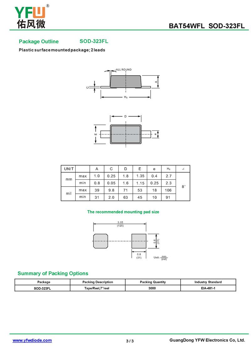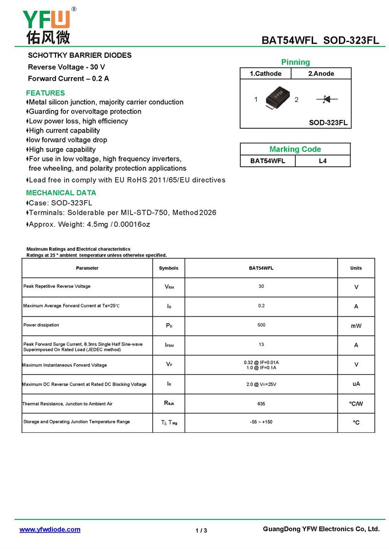 肖特基二極管BAT54WFL 規格書_價格_PDF手冊-廣東佑風微原廠BAT54WFL SOD-323FL_(YFW佑風微)品牌