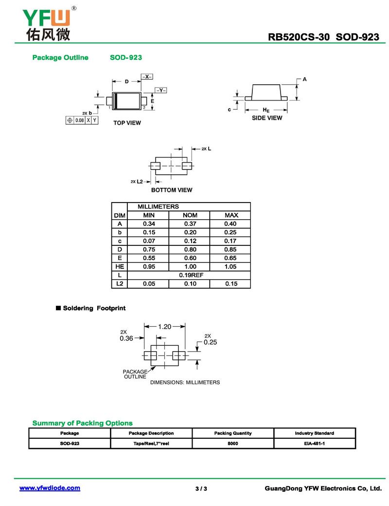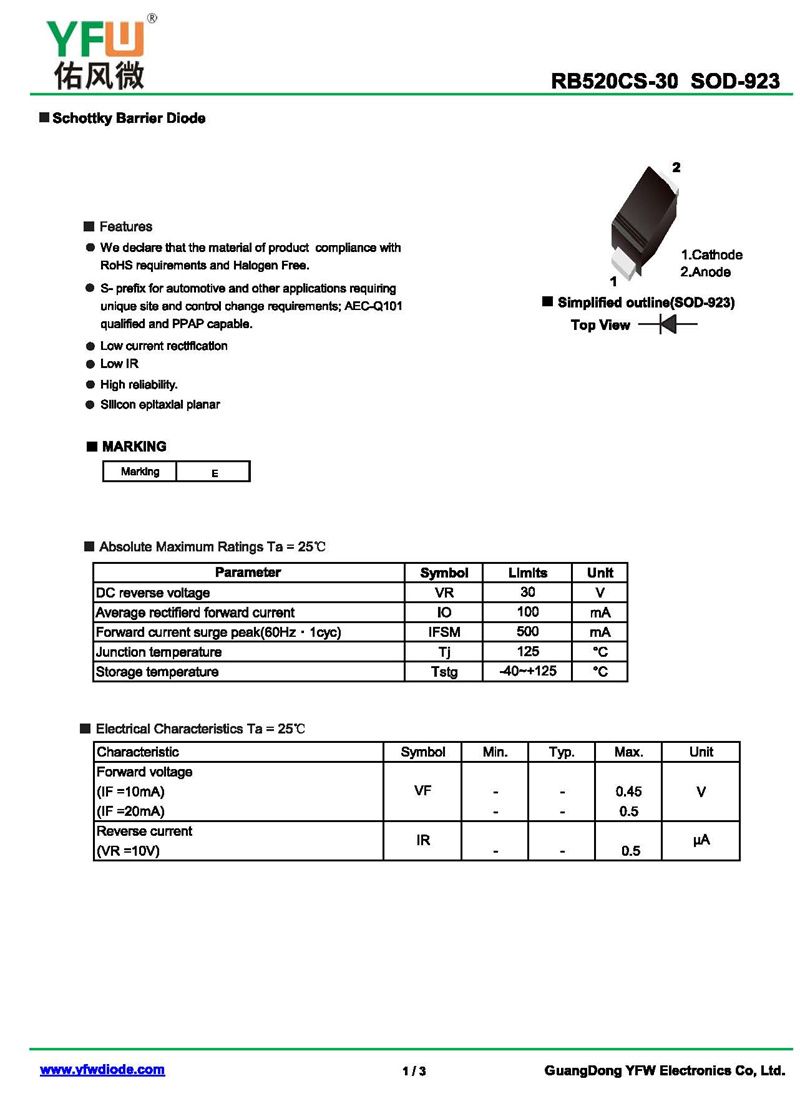 肖特基二極管RB520CS-30 規格書_價格_PDF手冊-廣東佑風微原廠RB521G-30 SOD-923_(YFW佑風微)品牌