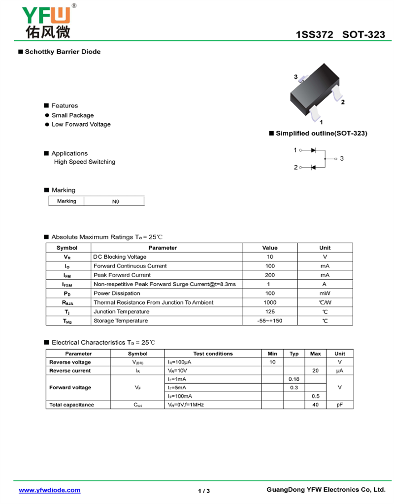 肖特基二極管1SS372 規格書_價格_PDF手冊-廣東佑風微原廠1SS372 SOD-323_(YFW佑風微)品牌