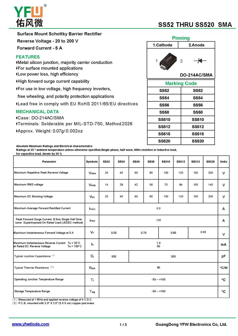 肖特基二極管SS520 規格書_價格_PDF手冊-廣東佑風微原廠SS520 SMA_(YFW佑風微)品牌