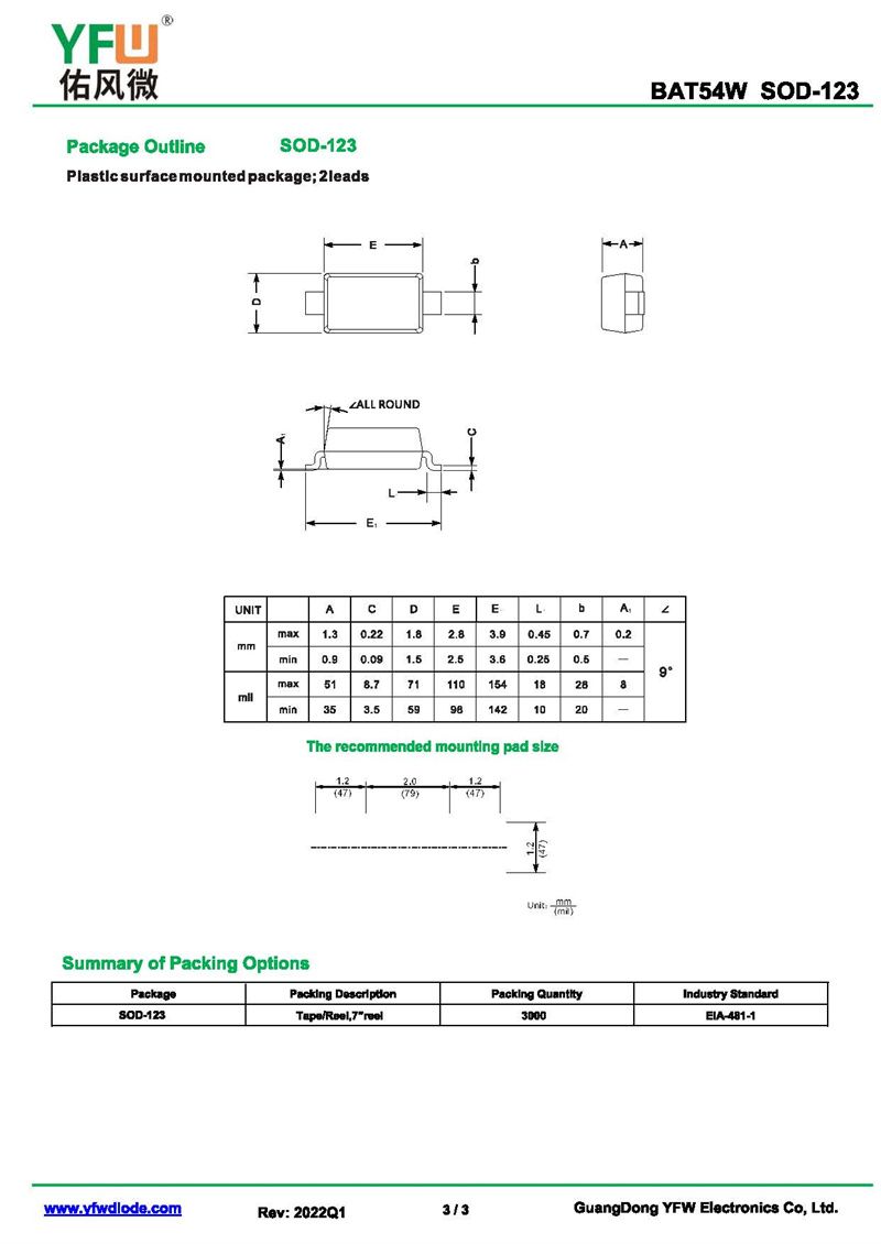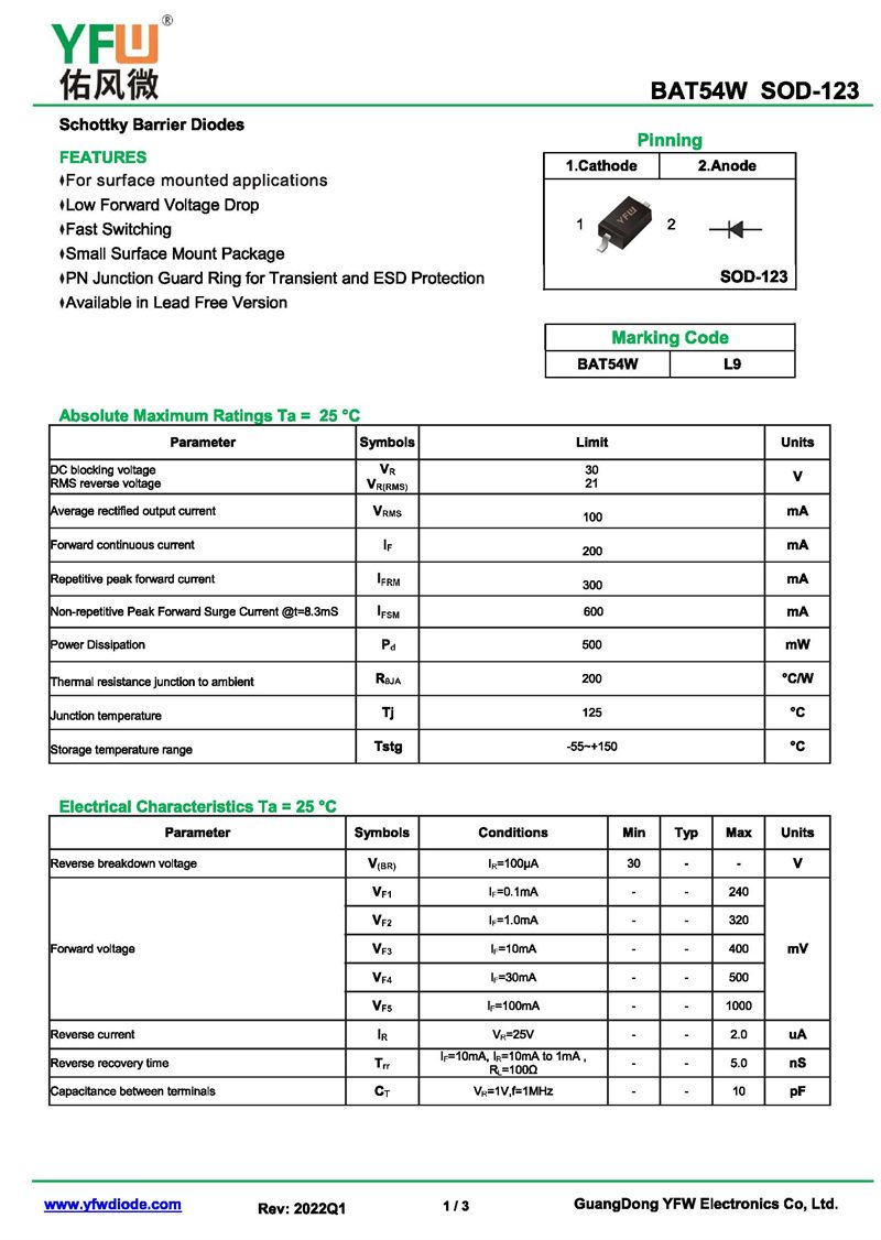 肖特基二極管BAT54W 規格書_價格_PDF手冊-廣東佑風微原廠BAT54W SOD-123_(YFW佑風微)品牌