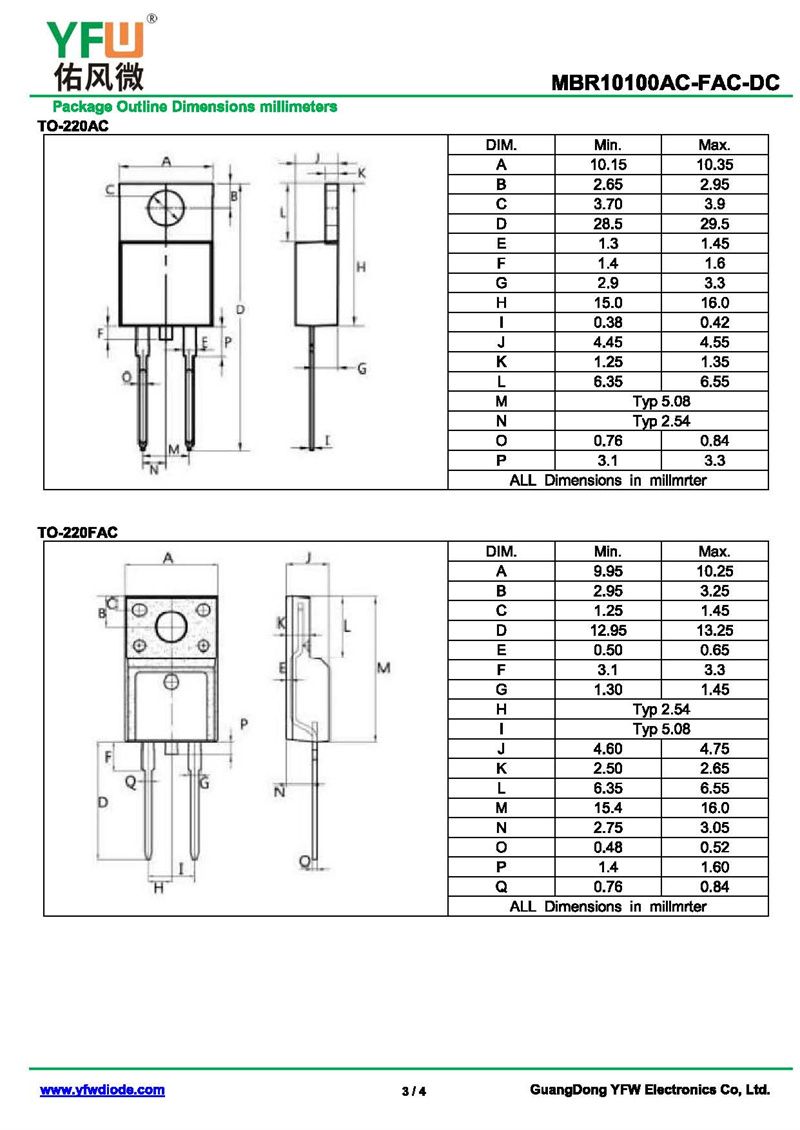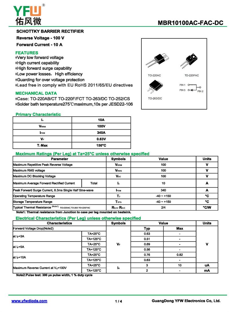 肖特基二極管MBR10100AC 規格書_價格_PDF手冊-廣東佑風微原廠MBR10100AC TO-220AC_(YFW佑風微)品牌