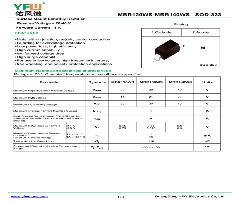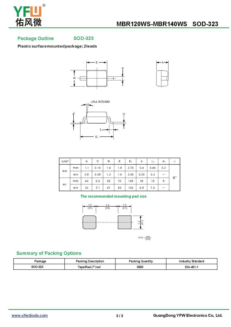 肖特基整流器MBR140WS 規格書_價格_PDF手冊-廣東佑風微原廠MBR140WS SOD-323_(YFW佑風微)品牌